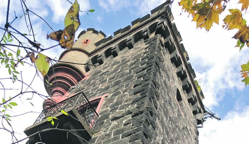Wie ein jüngeres Pendant zum Bergfried der Burg ragt der Neufville-Turm aus den Wipfeln der Bäume im Kriegerwald hervor. Gespräche mit einem Investor 2021 scheiterten, auch die Sanierung ruht seit fast vier Jahren.