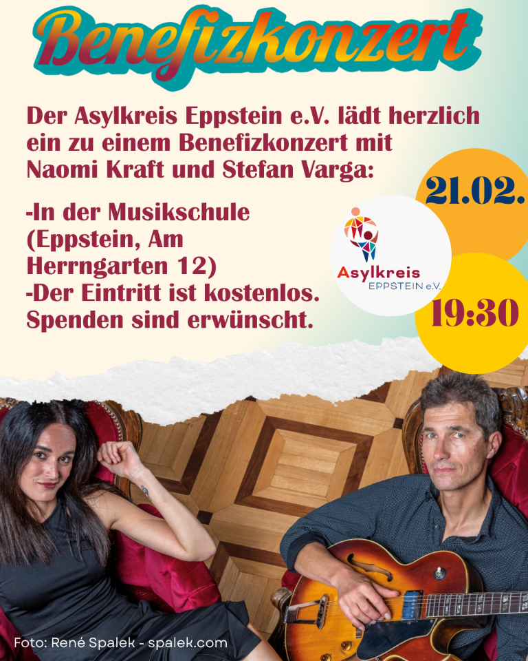 Der Asylkreis Eppstein lädt ein zu einem Benefizkonzert mit den renommierten Musikern Naomi Kraft (Gesang) und Stefan Varga (Gitarre). Sie spielen am Samstag, 21. Februar, ab 19.30 Uhr in der Musikschule Eppstein-Rossert, Am Herrngarten 12. Der Eintritt ist kostenlos. Spenden sind willkommen.