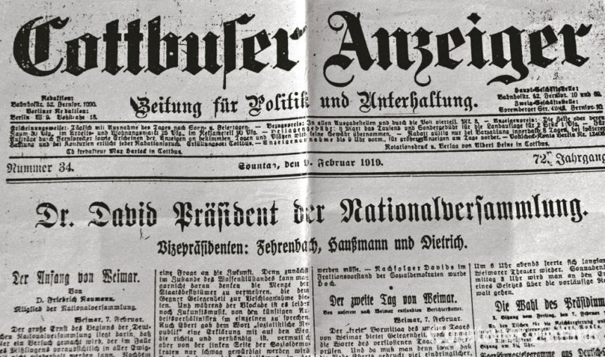 Der Cottbuser Anzeiger von Günter Senkels Geburtstag am 9. Februar 1919 ist ein Zeitdokument vom Beginn der Weimarer Republik.