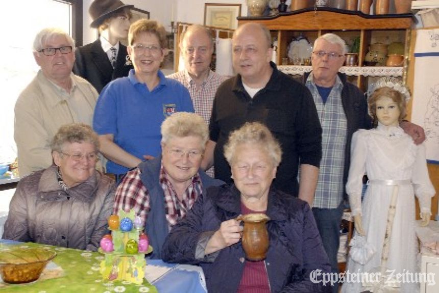 Sie stellten die Osterausstellung zusammen: (vorne v. li.) Maria Loos, Brigitte Jopp, Antonia Dambmann mit einem Pfingstkrüglein, (hinten v.li.) Helmut Kleindienst, Brigitte Kleindienst, Richard Kaus, Karl-Heinz Naunheim, Hans Kleindienst. Foto: Frauke Frerichs