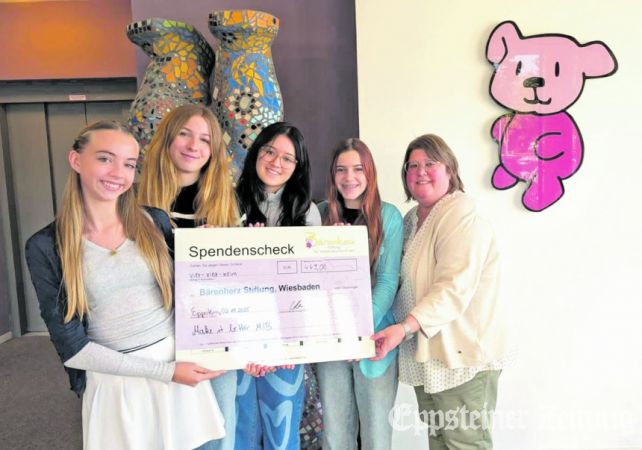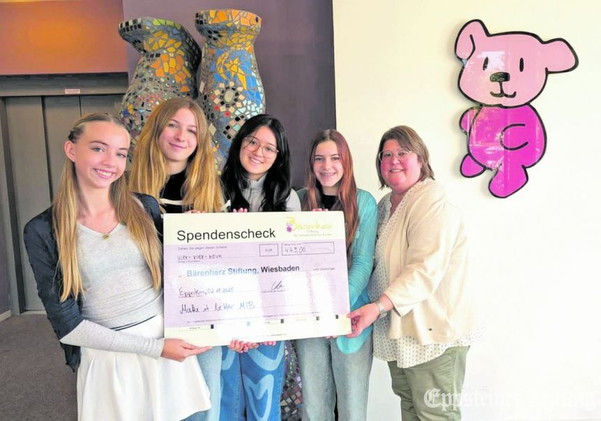 Die vier besuchen die G9a der Freiherr-vom-Stein-Schule und nutzten den ersten Tag der Herbstferien für einen Ausflug nach Wiesbaden. Dort überreichten sie die stattliche Summe von 449 Euro an Silke Moyer vom Fundraising-Team der Stiftung Bärenherz. Moyer begrüßte die vier Schülerinnen in den Räumen der Stiftung und bedankte sich für die Spende.