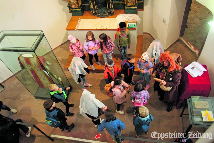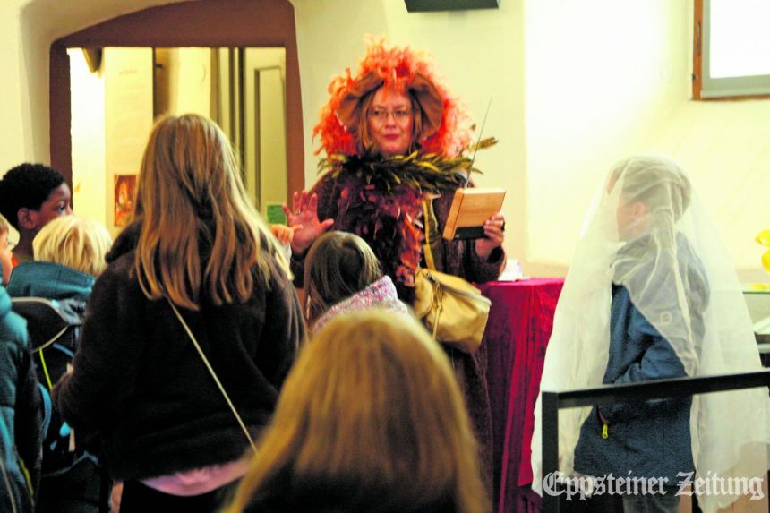 Zur ersten Führung am Dienstag vergangener Woche begrüßte sie eine Gruppe von Kindern aus der Ferienbetreuung der Comenius-Schule. Am Dienstag folgten ihr noch einmal etwa 20 Kinder auf ihrem Rundgang. Gleichzeitig erzählte Ritter Ulrich einer weiteren Gruppe von Kindern wie die Menschen im Mittelalter lebten und führte mit seiner nachgebauten Kastendrehleier vor, wie im 13. Jahrhundert Musik gemacht wurde.