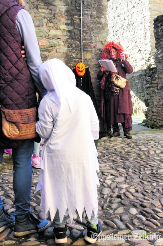 Auf der Treppe zum Burg-Archiv im kleinen Burghof zwischen Sakristei, Juchhe und Mainzer Keller lauschten die Jungen und Mädchen gebannt, wie der kleine Emil seinen großen Freund Ian vor dem Zugriff des Teufels bewahren will.