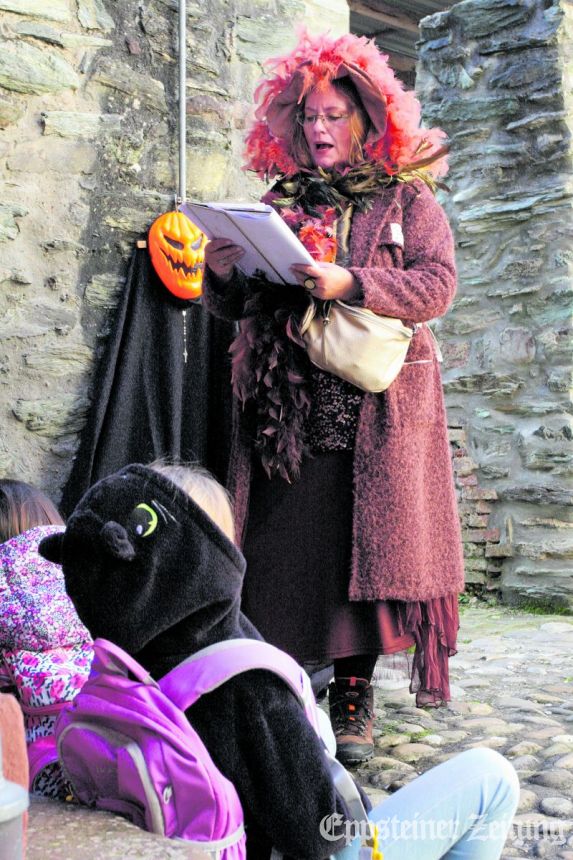 Die gruselige Geschichte von „Jack O’Lantern“, wie er den Teufel zwei Mal ausgetrickst hat, am Ende weder im Himmel, noch in der Hölle aufgenommen wurde und als ruheloser Geist, ausgerüstet mit einer Rübenlaterne und zwei glühenden Kohlestückchen aus der Hölle umherwandern muss, hat die Märchenerzählerin in eine kindgerechte Geschichte um Freundschaft und Solidarität eingebettet, um der eigentlichen Legende ein wenig von ihrer Ausweglosigkeit zu nehmen. Während der Erzählung ermunterte von Saldern die Kinder mitzuheulen, wenn Emil und seine Mutter den Teufel mit Werwolfgeheul vertrieben.