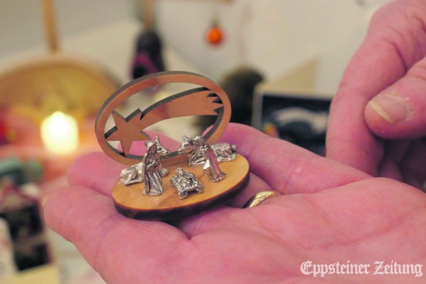 Besonders angetan ist Lucia Kretschmer von den Weihnachtskarten, auf der eine Schuhputzerin aus Bolivien mit bunten Stoffresten eine Szene aus der Weihnachtsgeschichte geklebt hat. „Mit solchen Postkarten finanzieren die Frauen der Schuhputzer das Schulgeld für ihre Kinder“, sagt Lucia Kretschmer. Jede Krippe habe ihre eigene Geschichte, sagt sie. Sie kennt fast alle. Zum Beispiel, wie die über 100 Jahre alte Krippengruppe auf dem Dachboden der Ehlhaltener Kirche entdeckt wurde. Der Ehlhaltener Stephan Racky hat die arg ramponierten Figuren aus Gipsguss geklebt, gespachtelt und bemalt. „Ich hatte wochenlang weiß bemehlte Hände“, sagt er am Rand der Ausstellung.