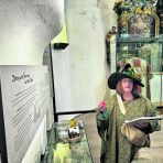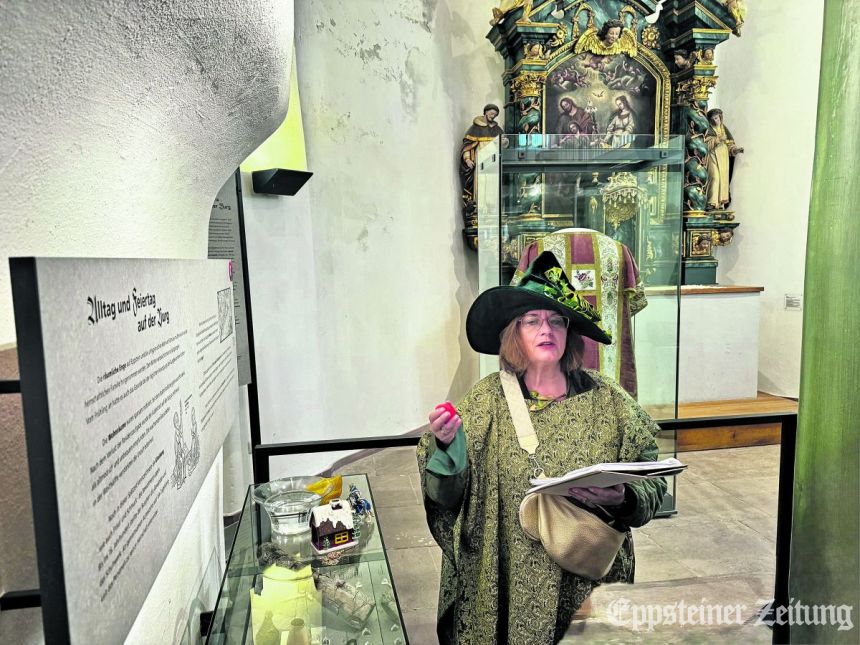In der Kemenate trug sie „Das tapfere Schneiderlein“ der Brüder Grimm vor. Dabei hatte sie zahlreiche Requisiten dabei, wie den aus dem Märchen berühmten Ledergürtel mit der Aufschrift „7 auf einen Streich“. Ein Kind durfte schließlich – wie im Märchen – mit einer Fliegenklatsche auf ein Brot hauen. Informiert wurde nebenbei auch über den Beruf eines Schneiders. Von Saldern erzählte auch über Bügeleisen der früheren Zeit und empfahl den Besuch der Änderungsschneiderei in der Burgstraße, weil es dort im Fenster noch ein altes Bügeleisen zu bewundern gebe.