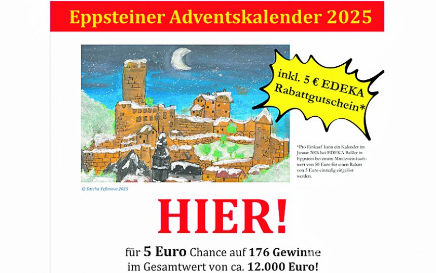 Der Eppsteiner Adventskalender ist ab 1. November in allen teilnehmenden Einzelhandelsgeschäften im Stadtgebiet erhältlich. Jeder Kalender gilt zudem im Januar 2026 einmalig als Gutschein in Höhe von 5 Euro bei einem Einkauf bei Edeka Baßler Eppstein im Wert von mindestens 50 Euro.