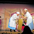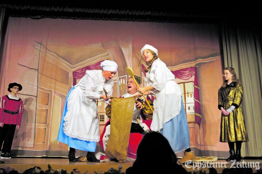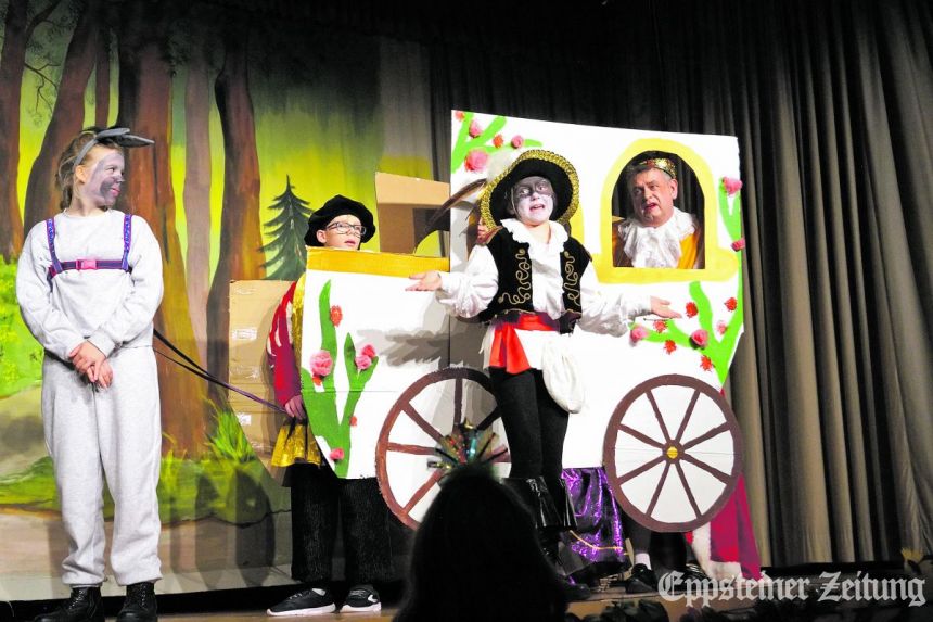 „Es klappert die Mühle am rauschenden Bach – klipp klapp“, ertönte zu Beginn des Stücks und versetzte das Publikum mitten ins Geschehen. Der jüngste Müllerssohn Franz alias Darian Fejfar war untröstlich, sollte er doch nur einen Kater erben. Doch Konstantin – hervorragend gespielt von Friederike Paul – überraschte ihn damit, dass er auf zwei Beinen gehen und sprechen konnte. Franz ließ sich dazu überreden, ihm sein letztes Geld zu geben, damit er sich einkleiden und Stiefel kaufen konnte. Für einen Streifzug unter Menschen passend ausgestattet erfuhr der schlaue Kater, dass der König – verkörpert von Volker Steuernagel – auf seine Leibspeise verzichten muss, da keine Rebhühner auf dem Markt erhältlich waren. Aus lauter Verzweiflung erwarb der Hofmarschall alias Hauke Hasselmann einen Esel von dem er glaubte, dass er Rebhühner aufspüren könne. Doch Fehlanzeige – vor der Pause lieferten sich die beiden deshalb eine lustige Verfolgungsjagd.