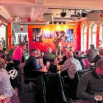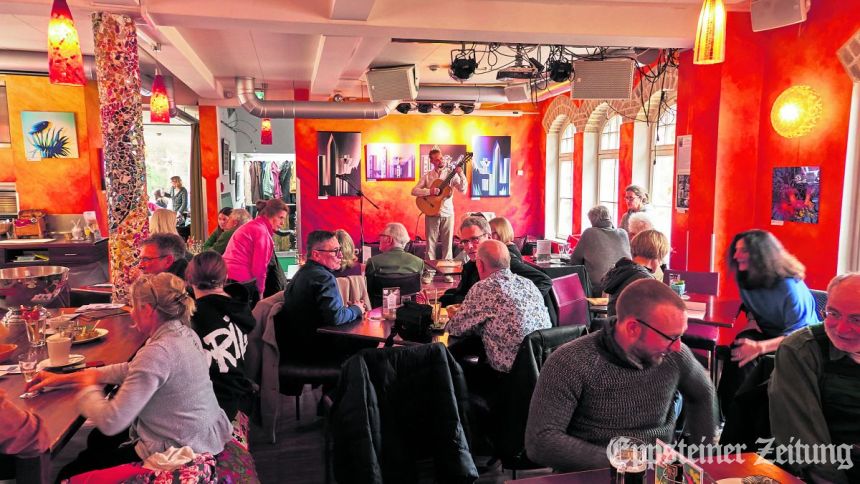 Hauptaugenmerk liegt diesmal auf seinen Experimenten am Computer, Doppelbelichtungen und Fotocollagen, für die er auch seine Unterwasseraufnahmen verfremdete und auf seinen eindrucksvollen Bildern von der Frankfurter Skyline, die Rödiger skiachromatisch bearbeitet hat: So warf auch der unverkennbare Messeturm farbige Schatten, während der Musiker Mateo Martinez davor zur Vernissage auf seiner Gitarre spielte und sich in der Wunderbar die zahlreichen Gäste an den Tischen angeregt über die Ausstellung unterhielten.