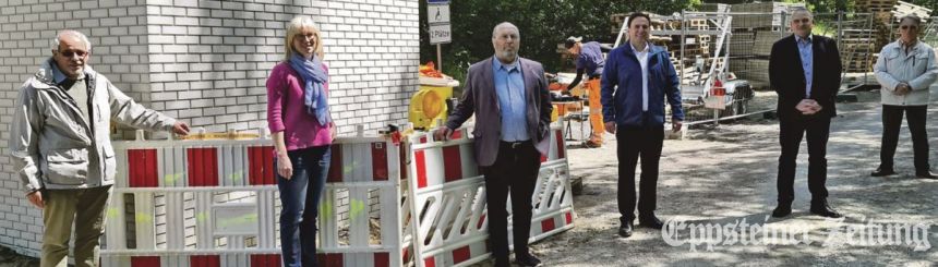 Stadtrat Josef Bähner, Ortsvorsteherin Andrea Sehr, Stadtrat Harald Eulenberger, Bürgermeister Alexander Simon, Projektleiter Volker Schneider und Stadtrat Elmar Alhäuser (v.l.) reihten sich vor dem neuen Hauptverteiler in Niederjosbach auf.Foto: Deutsche Glasfaser