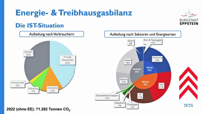 Ein Jahr lang hat Klimaschutzmanagerin Julia Schomburg Daten und Ideen gesammelt, Statistiken erhoben und fünf Handlungsfelder mit 28 Maßnahmen ausgemacht, die am Ende dazu führen sollen, dass Eppstein bis zum Jahr 2045 klimaneutral ist, also der Ausstoß von Treibhausgasen weitgehend vermieden wird. Der CO2-Ausstoß von aktuell 71 282 CO2 laut Stand von 2022 für Wärme, Stromerzeugung und Verkehr, soll bis 2045 auf ein Minimum gesenkt oder kompensiert werden, zumindest in den fünf hauptsächlich betrachteten Handlungsfeldern: Erneuerbare Energien, nachhaltige Mobilität, klimagerechte Infrastruktur und Stadtentwicklung. Hinzu kommen Einrichtungen der Kommune, bei deren Bau oder Sanierung die Stadt als Vorbild dienen solle sowie die Beteiligung und Information der Bürger.