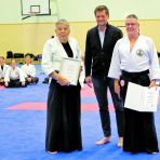 Aikido bedeutet auch Voneinander und Miteinander lernen. Dazu gab es anschließend Gelegenheit bei Techniken der Leeren Hand mit Bernhard Retzbach (1. Dan), Techniken gegen Messerangriffe mit Michael Ehrhart (3. Dan) und Techniken mit dem Stab mit Michael Helbing (5. Dan). Bereits am Vormittag hatten sich Kinder und Jugendlichen zu einem gemeinsamen Training getroffen. Unter dem Titel „Family & Friends“ waren dazu auch Freunde und Angehörige eingeladen, Aikido kennenzulernen. Unter der Anleitung des Kinder- und Jugendtrainer-Teams um Michael Ehrhart (3. Dan) herrschte schnell ein buntes Treiben auf der Matte.