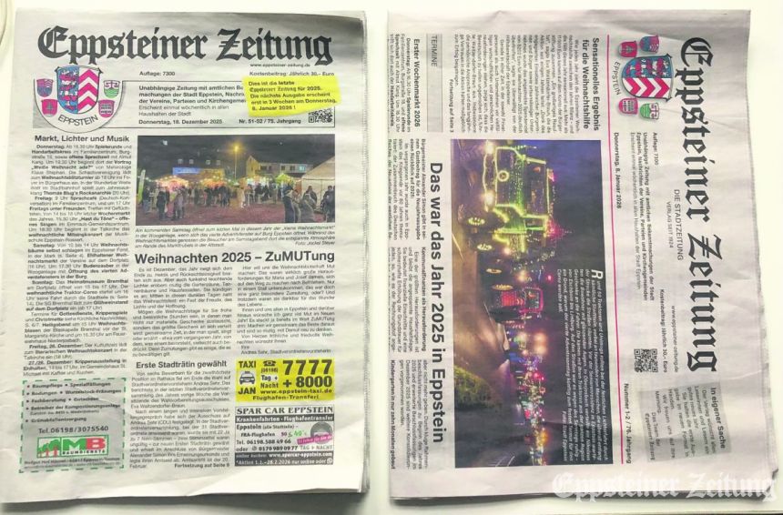 Wir haben unterschätzt, dass der Formatwechsel bei unseren Leserinnen und Lesern zu Verwirrung alter Gewohnheiten führen könnte. Manche haben die neue EZ in ihrem Briefkasten nicht als das erkannt, was sie ist und die erste Ausgabe 2026 der Eppsteiner Zeitung als vermeintliches „Werbeblättchen“ entsorgt. Das soll selbstverständlich nicht passieren. Deshalb haben wir auf dem Foto unten links die Zeitung früher und heute nebeneinander gelegt, um den Unterschied zu zeigen.