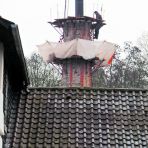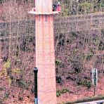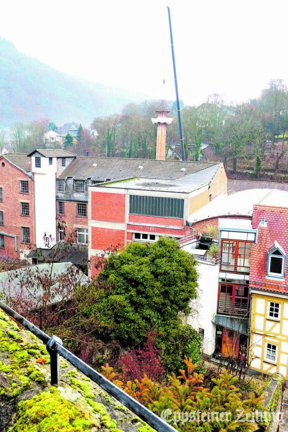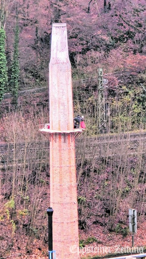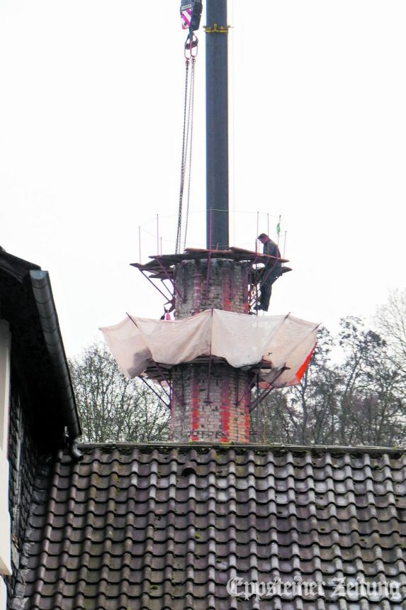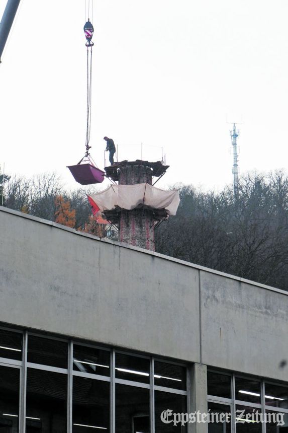 Seit einigen Tagen sind Arbeiter auf einem Gerüst zu sehen, das wie ein Kragen im oberen Drittel des Schornsteins um das Mauerwerk befestigt wurde. Mit Hilfe eines Krans wurden die obere Mauerkrone und ein Teil des Schlotes Stein für Stein abgenommen. Aufmerksame Eppsteiner meldeten sich daraufhin bei der Redaktion.