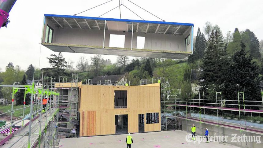 In der Nacht zum 16. April wurden die ersten Module geliefert und in den frühen Morgenstunden eingebaut. Am 29. April feierte die Stadt Richtfest, keine acht Wochen nach dem ersten Spatenstich. Anschließend wurde mit dem Innenausbau begonnen. Im Oktober wurde das Gebäude eingerichtet und mit Möbeln ausgestattet. Am 29. Oktober erfolgte die Abnahme: Die Erlaubnis zum Betrieb eines Kindergartens wurde erteilt. Nun ist die Errichtung der Außenanlagen in vollem Gange.