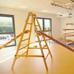 Darüber hinaus gibt es einen Bewegungsraum mit Klettergerüsten für jede Altersgruppe. In den großzügigen Fluren laden kleine Sitzgruppen mit gepolsterten Stühlen zum Verweilen ein. Die Einrichtung kommt mit wenigen Farben aus: Naturholzmöbel, sandfarbene Fußböden, hellgraue Teppiche und weiße Wände. Nun ist es Aufgabe der Kinder Farbe in den Kita-Alltag zu bringen.