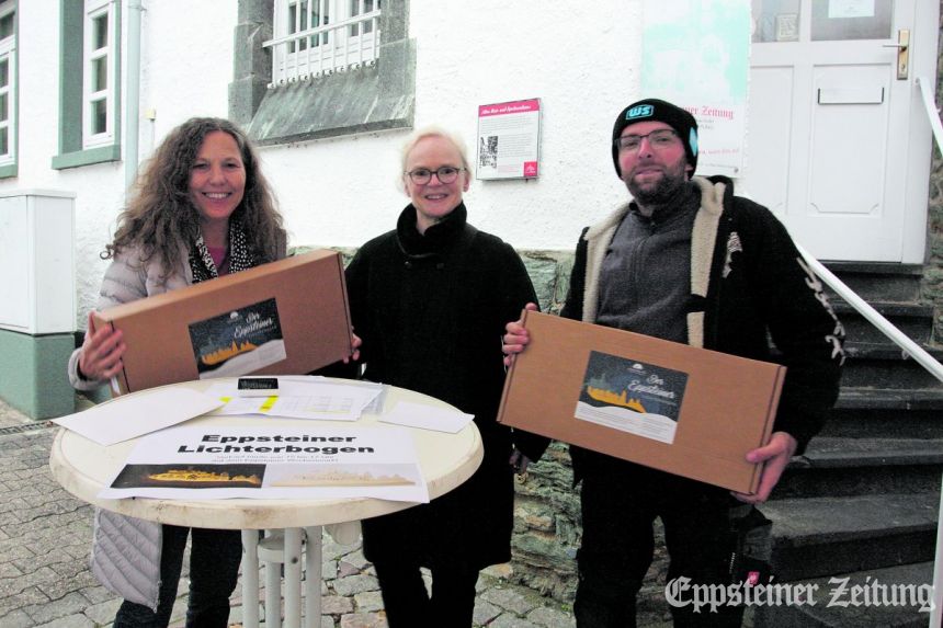 Auch EZ-Geschäftsführerin Julia Palmert kaufte für die Redaktionsräume einen der neuen Lichterbögen, die die Stadt bei der Glashüttener Firma „Schnee und Reh“ in Auftrag gegeben hat. Pflasterschisser, einige Altstadthäuser, Talkirche und Burg sind als Silhouette in Sperrholz gearbeitet mit indirekter Beleuchtung. Sibylle Yaakov von der Wirtschaftsförderung der Stadt hatte an ihrem Stand vor dem Verlagsgebäude viel zu tun. 20 Lichterbögen wechselten an diesem Tag den Besitzer.