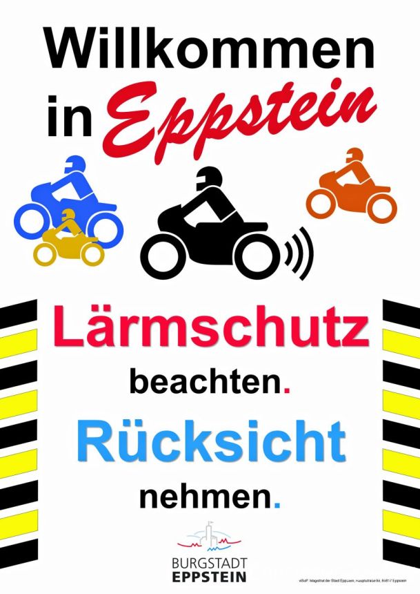 Ein rücksichtsvolles Miteinander, die Einhaltung geltender Gesetze und Geschwindigkeitsregelungen sind Voraussetzung, um Interessenskonflikte zu vermeiden. Die berechtigten Interessen der Bürgerschaft und die der Motorrad Fahrenden gilt es, in einen fairen Ausgleich zu bringen. Dabei sind Motorradfahrer in Eppstein herzlich willkommen.