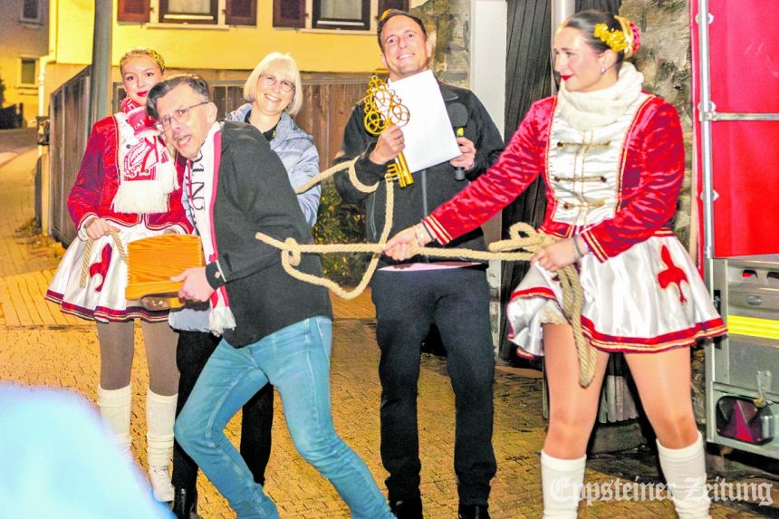 Die Menschen prosteten sich zu. Brezelduft und Abendluft wurden unterbrochen vom Hilferuf des Bürgermeisters. Die Gardistinnen hatten Mühe, den Strick festzuhalten, an den das Eppsteiner Dreigestirn gebunden war. „Die wehren sich ja immer noch“, resümierte Jannis Rösner. Damit lag er richtig. Bürgermeister Simon forderte seine Freilassung und führte ein Argument ins Feld, mit dem niemand gerechnet hatte: „Der Regiomat ist endlich offen.“ Zustimmendes Murmeln und Kopfnicken auf dem Dorfplatz.