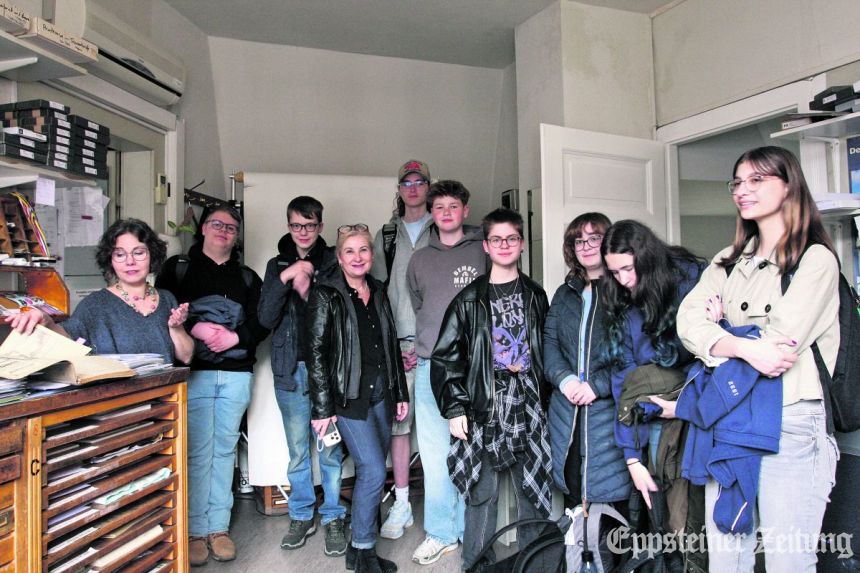 Redakteurin Beate Schuchard-Palmert (li.) führte die Gruppe auf dem Rundgang zu historischen Bleilettern in alten Setzkästen und zeigte ihnen modernes Computer-Layout. Die Jugendlichen fragten nach Recherchemethoden mit und ohne Hilfe des Internets. Zeitunglesen als Informationsquelle fanden alle wichtig, nur ziehen einige das Online-Format vor, während andere lieber zum Papier greifen. Foto: Julia Palmert
