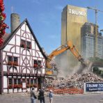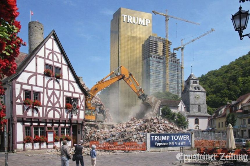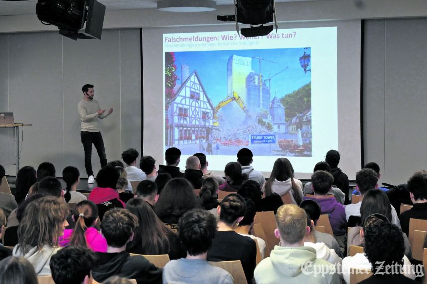 Schwieriger sei das bei Bildern, insbesondere bei KI generierten Bildern. „Bilder erwecken sofort Emotionen“, macht Drotschmann mit einigen Beispielen deutlich. Umso wichtiger sei es, nach Merkmalen für Echtheit oder Fake zu suchen. Keine Schwierigkeit hatten die Schüler damit bei zwei Fotos aus Eppstein, die Drotschmann mit Chat GPT bearbeitet hatte: Auf dem Schulhof machte sich vor der Sporthalle die Baustelle für ein amerikanisches Schnellrestaurant breit und unterhalb der Burg musste für einen angeblichen Besuch des US-Präsidenten das Alte Rathaus weichen, um zwischen Burgmauer und Talkirche Platz für einen neuen Trump-Tower zu schaffen.