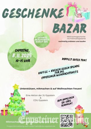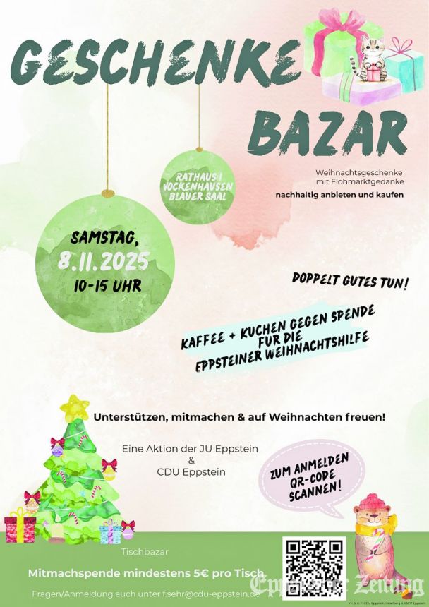 Wer selbst mitmachen möchte, kann einen eigenen Tisch anmelden. Gegen eine Mitmachspende von mindestens 5 Euro pro Tisch dürfen alle Dinge verkauft werden, die sich ideal als Weihnachtsgeschenke eignen. Der Aufbau beginnt um 9 Uhr. Die Anmeldung geht ganz einfach online mit dem Formular unter https://forms.office.com/e/WgunvPUisT oder einer E-Mail an f.sehr[at]cdu-eppstein[dot]de. Weitere Informationen werden gesondert per E-Mail bekannt gegeben.
